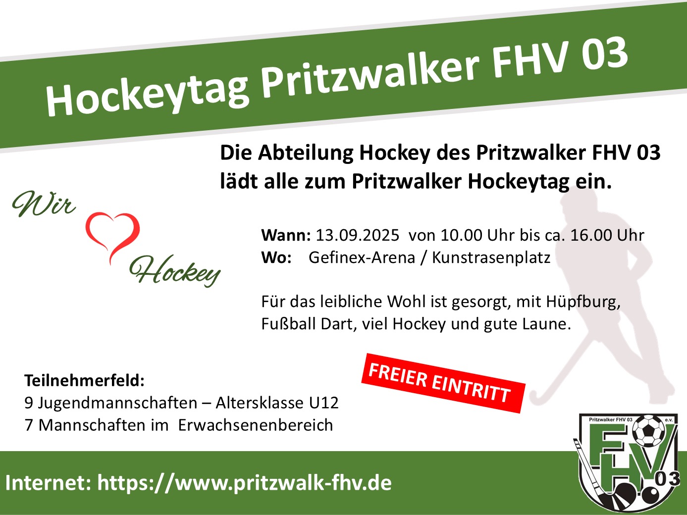 Seit Gründung des FHV im Jahr 2003 wurden durch ehrenamtliche Mitglieder die sozialen und gemeinschaftlichen Ideale in der Stadt Pritzwalk in Sachen Fussball und Hockey geprägt. Kinder, Jugendlichen, Erwachsenen und Rentnern ist es zu verdanken, dass der Verein eine Entwicklung genommen hat, welche über die Grenze der Stadt hinaus bekannt ist. Vielen Sponsoren im Umkreis von Pritzwalk sowie die in den letzten Jahren sehr gute Förderarbeit der Verantwortlichen der Stadt Pritzwalk und natürlich der uneigennützliche Einsatz aller Ehrenamtlichen ist es zu verdanken, dass der Pritzwalker FHV 03, diese sehr gute, erfolgreiche und verantwortungsvolle Arbeit, für die Kinder- und Jugendförderung in der Prignitz leisten kann.